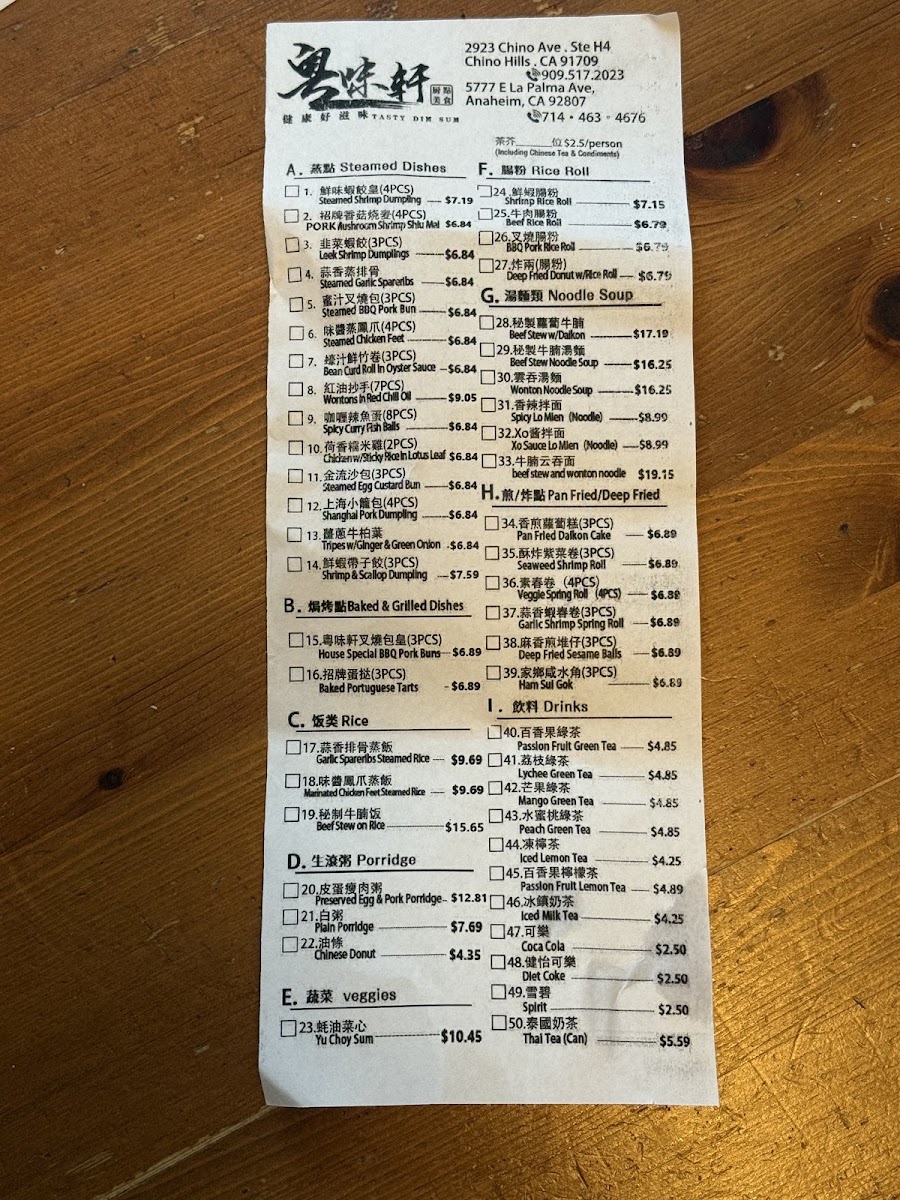 The menu at Tasty Dim Sum House - Anaheim offers a delightful balance of classic and inventive dim sum dishes that cater to a wide range of tastes. The Raw Porridge selection includes Plain Porridge, Preserved Egg Pork Porridge, and Chinese Donut, providing comforting options for a light start. The Fried section is packed with flavorful bites like Garlic Spring Roll (3), Vegetarian Spring Roll (4), Seaweed Shrimp Roll (3), Pan-Fried Daikon Cake (3), and Deep-Fried Sesame Ball (3), perfect for sharing. For noodle lovers, choices include Beef Stew Only, Wonton Noodle Soup, Beef & Wonton Noodle Soup, Spicy Lo Mien, and Beef Stew Noodle Soup, offering hearty and savory options. The Rice Noodle rolls, such as Plain Rice Noodle Rolls, BBQ Pork Rice Noodle, Beef Rice Noodle, Shrimp Rice Noodle, and Deep-Fried Donut With Rice Roll, are a satisfying combination of texture and flavor. Fresh Vegetables like Yu Choy Sum provide a light, green complement to the richer dishes. The Baked treats, including House Special BBQ Pork Buns (3) and Egg Tart (3 Pcs), deliver a sweet and savory finish, while the Steaming Point offerings, such as Shrimp & Scallop Dumpling, Steamed Egg Custard Bun, B.Curd Roll Oyster Sc (3), Chicken With Sticky Rice In Lotus Leaf, and Steamed Shanghai Pork Dumpling (4), showcase delicate steaming techniques that highlight the freshness of the ingredients. Drinks like Coca-Cola, Sprite, Iced Milk Tea, Mango Green Tea, and Iced Lemon Tea round out the experience, providing refreshing options to accompany the meal. Overall, the menu strikes a thoughtful balance between traditional favorites and specialty items, each dish clearly labeled with quantities where appropriate, making it easy for diners to explore a variety of flavors in one visit.